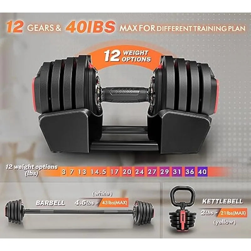 - 【12 Weight Increment for Different Training Goals】-- The 12 weight options of dumbbells from 3 to 40 pounds is perfect for training from lighter weight lifting to heavier compound movements. This also allows multiple family members to train based on their own skill level, even fitness beginners are very easy to use. The weight range of kettlebell & barbell is slightly different from the dumbbell mode, please refer to the scale chart.